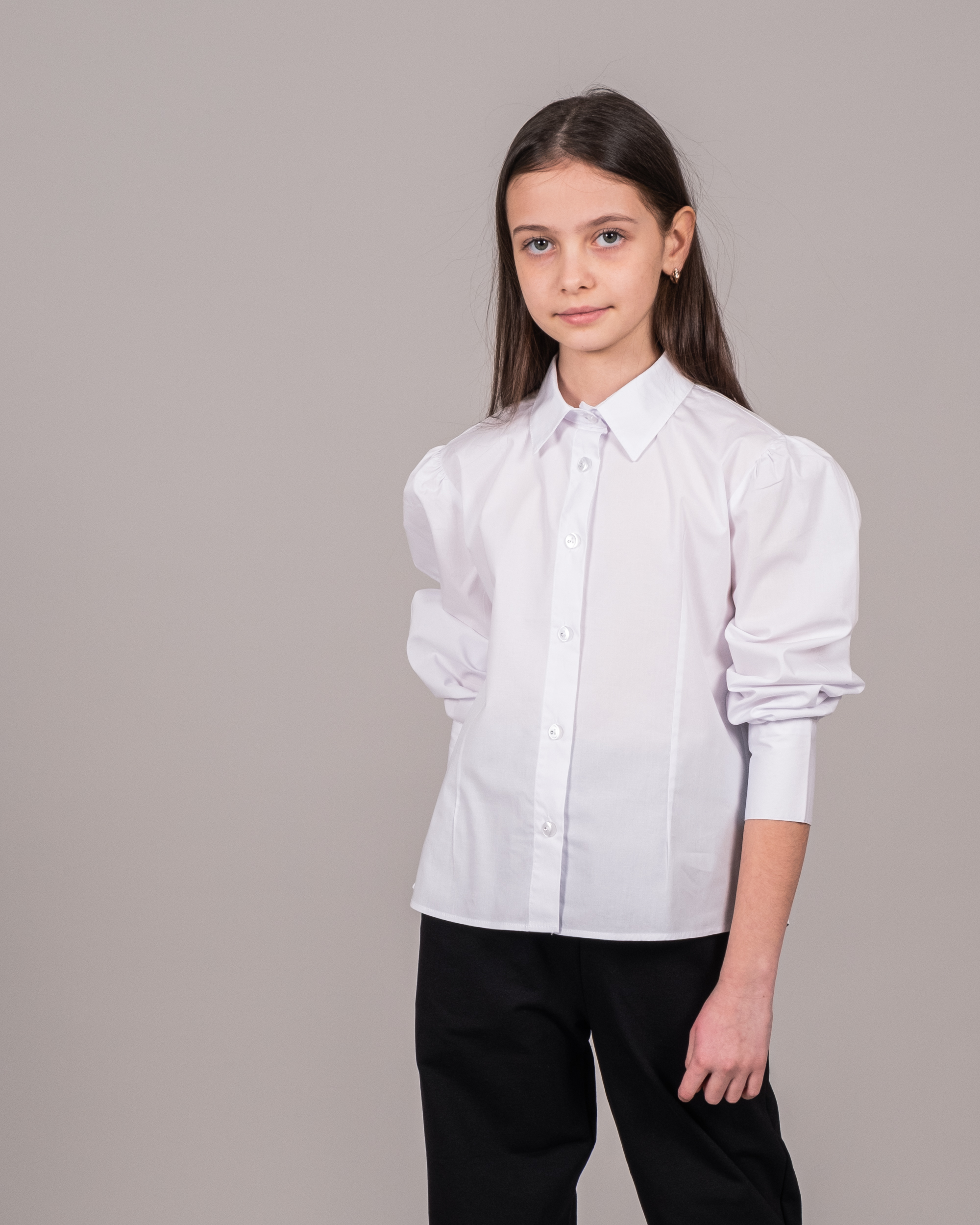 Белая блузка-рубашка с отложным воротничком - это классический вариант для девичьей школьной формы и торжественных мероприятий. Длинные рукава на манжетах с пуговицами. Воротник отложной.  Блузка изготовлена из тонкого полотна на хлопковой основе, очень приятного телу. Она хорошо держит форму при активной носке и не теряет ее после многократных стирок. В такой милой блузке вашему ребенку будет очень комфортно на уроках в школе и торжественных мероприятиях.