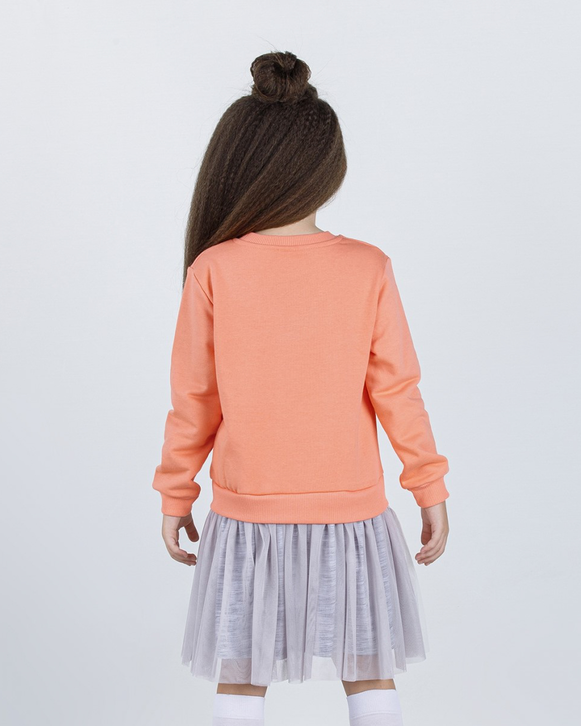 Платье Dmb для девочки оптом, выполнено из трикотажа футер (петля) с длинными рукавами и округлой горловиной, юбка трехслойная сшита из сетки. Платье украшено оригинальным принтом.