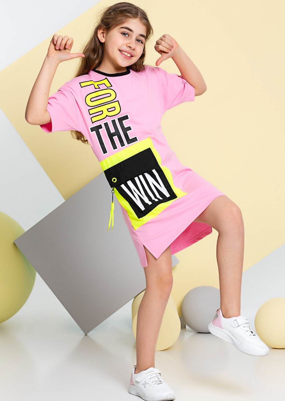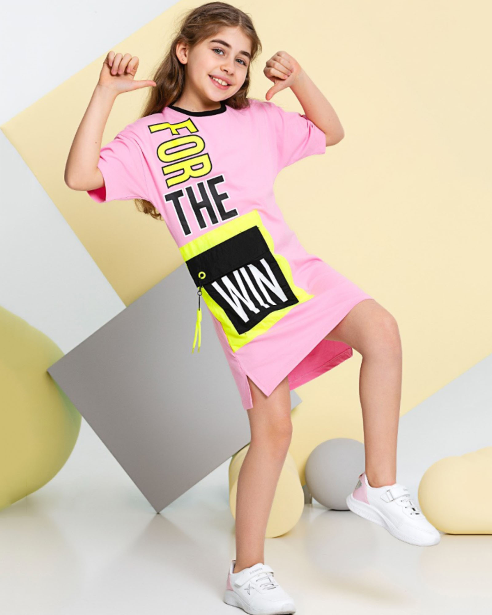 Стильное, необычное, очень комфортное для девочки, платье выглядит потрясающе. Оригинальный дизайн, построенный на модной  форме и контрасте шрифтовой графики принта, подчеркивает остроту и оригинальность модели. Разрезы по бокам способствуют свободе движений девочки. Платье имеет модную длину до колена.