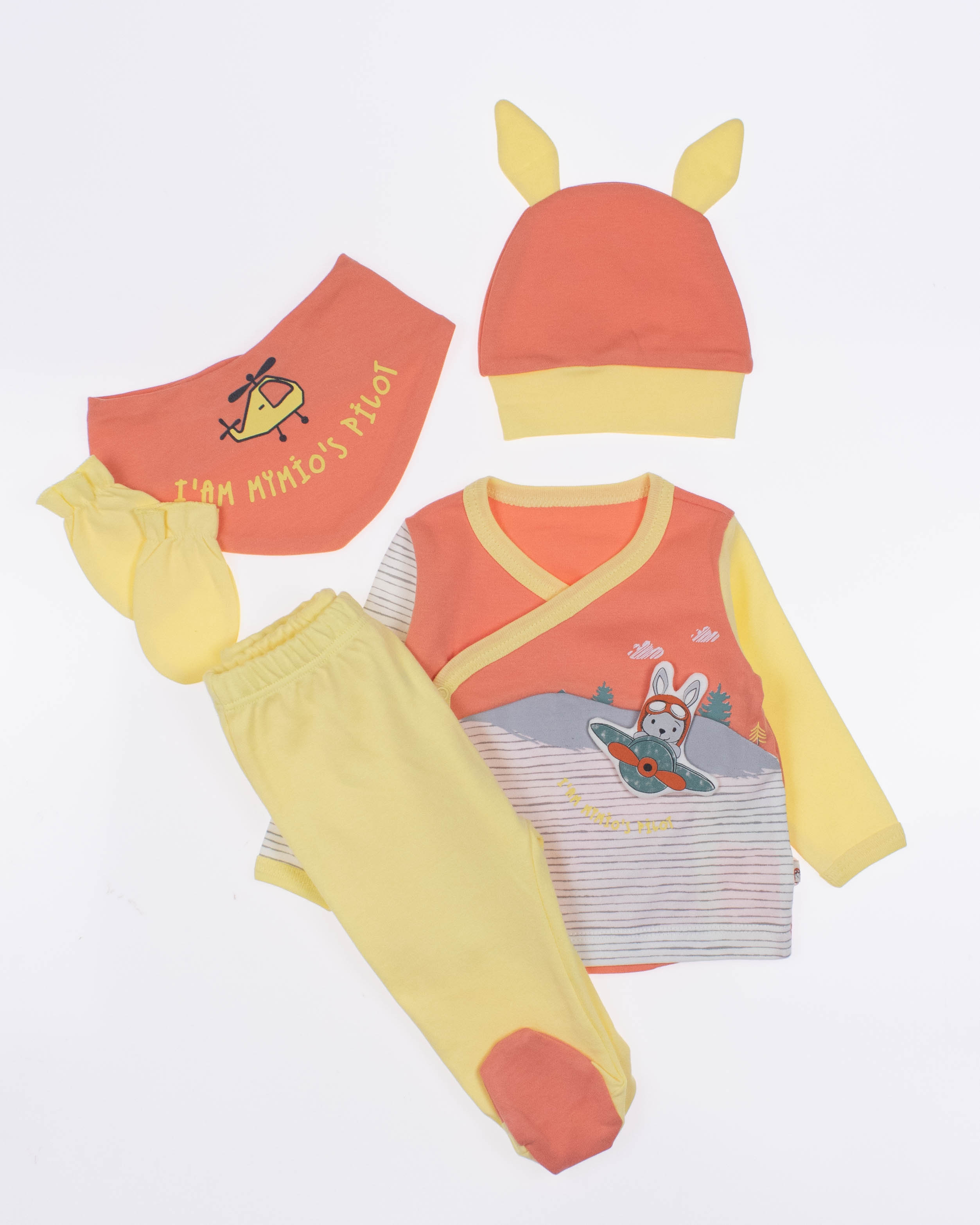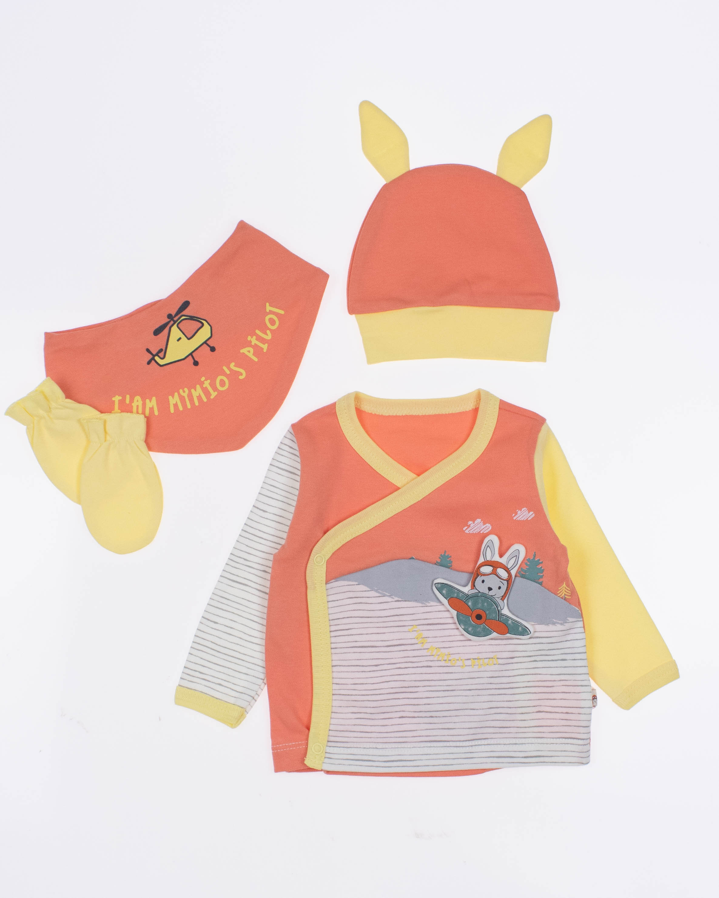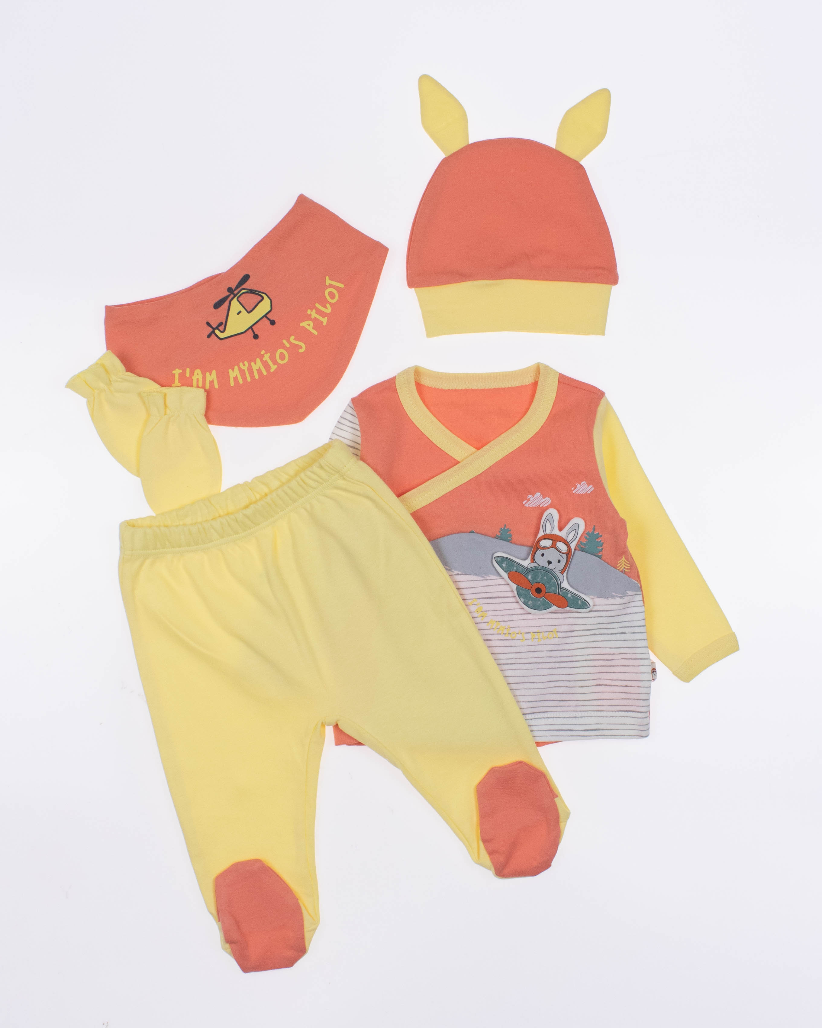 Функциональный, удобный и симпатичный комплект MYMIO BABY из 100% хлопка. Он включает в себя пять предметов: это кофточка с длинным рукавом, ползунки, шапочка, слюнявчик и рукавички. Каждую деталь можно надевать отдельно или комбинировать с другими вещами.